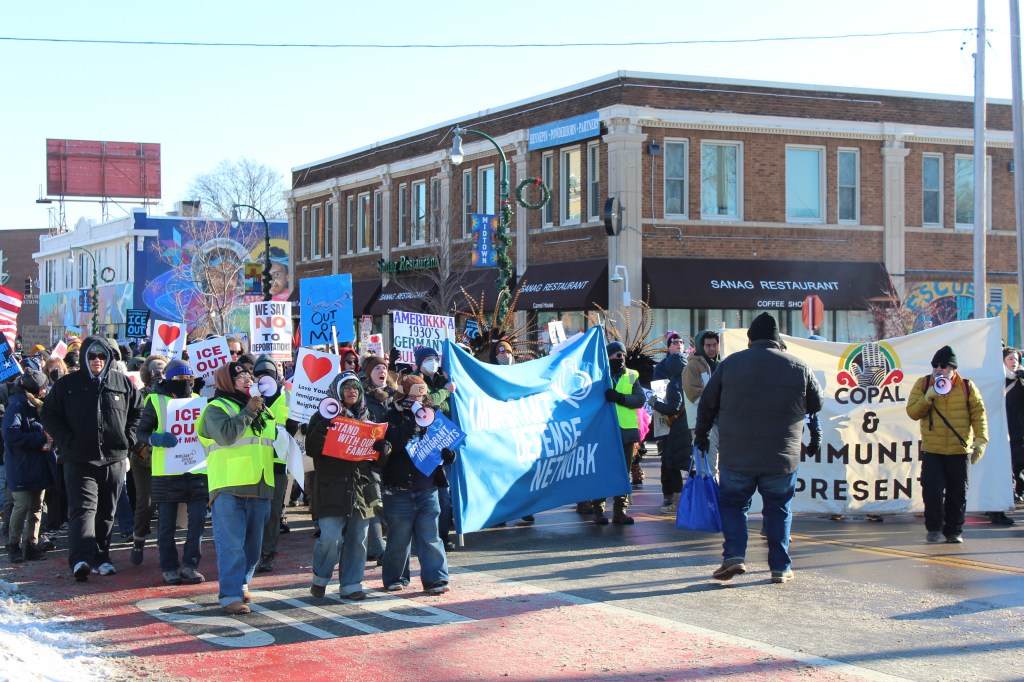 The march started at 11:30 on Lake Street and Bloomington, despite temperatures being in the low 10s. Organizers from MIRAC, COPAL, FRSO, and more helped make this march possible, and hundreds of community members showed up.